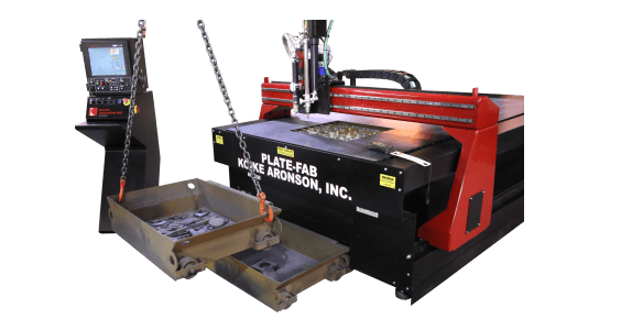 The PlateFab from Koike Aronson, Inc. is a unitized design incorporating a downdraft or water cutting table. Engineered for increased precision and more options at a lower cost the PlateFab can be configured to cut plates sizes 5 or 6 foot wide by 10 or 12 foot long and up to 2 inches thick steel.