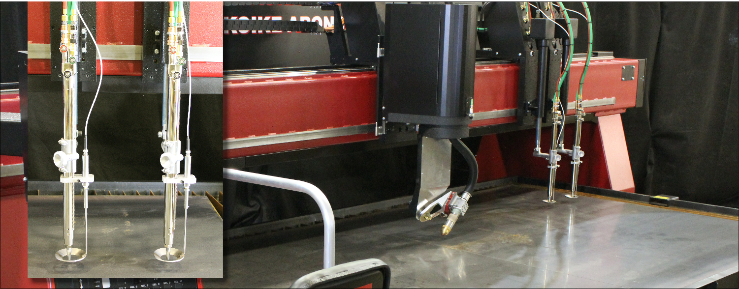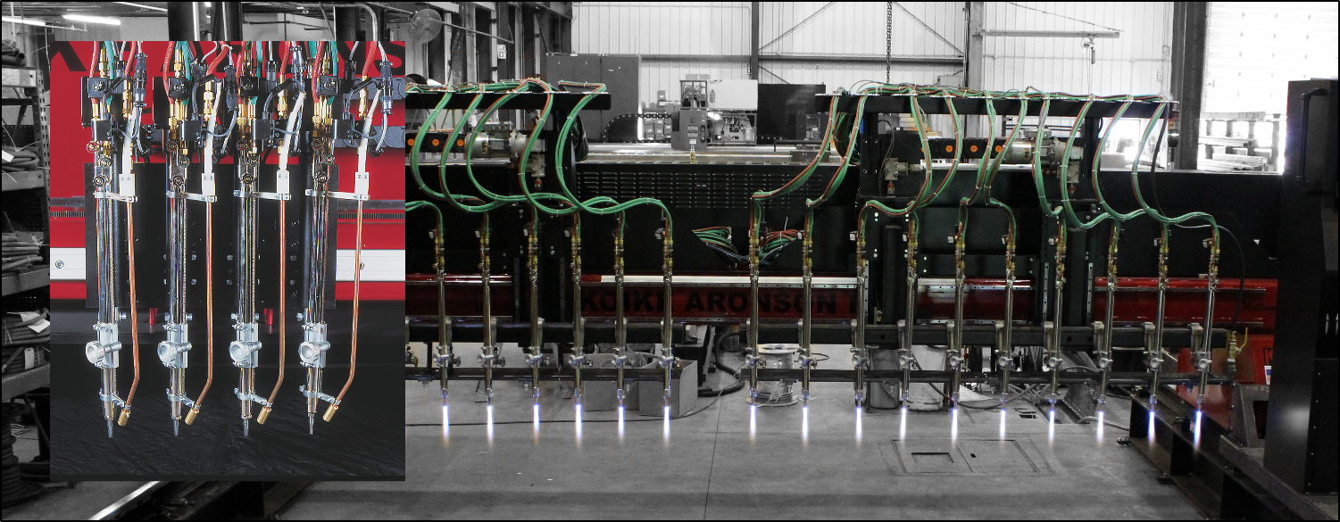 - Oxy-Fuel Torch Stations (Up to four stations available): Model “G” motorized lifter, 6-inch (150 mm) stroke at 40 IPM. All stations are controlled from Operator console. 500L Koike torch offers 1/8″ to 12″ (3 mm to 300 mm) thick plate cutting available. Capacitive height control (not shown) and automatic ignition available (optional).